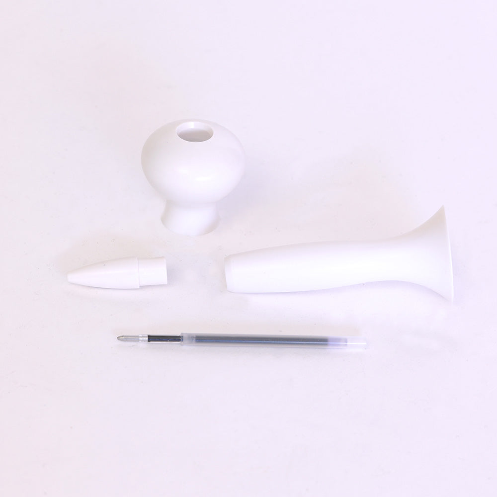 繊細に削ぎ落とされたシルエットは、まるでミニチュアの花器のよう。細長いペン軸と安定感のある底部(ベース)が一体化したデザインは、視線をそっと受け止める落ち着いた印象を与えます。
