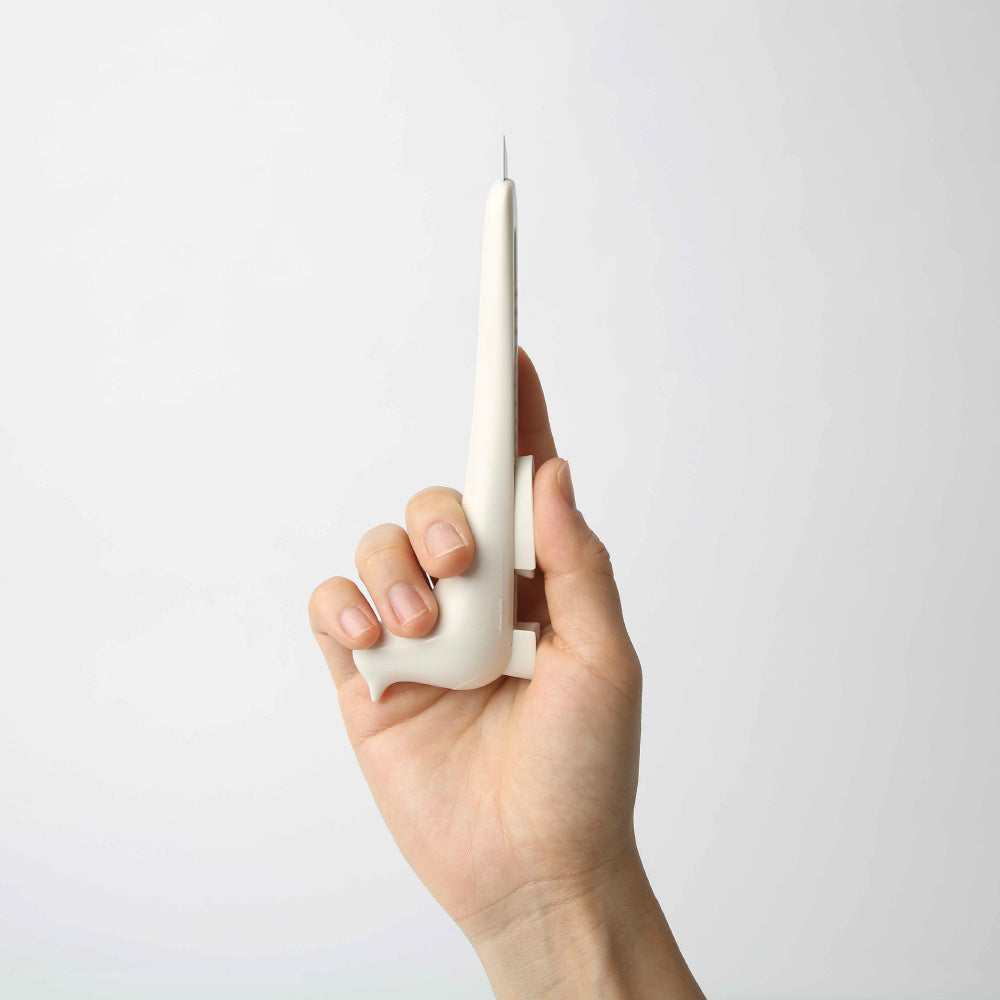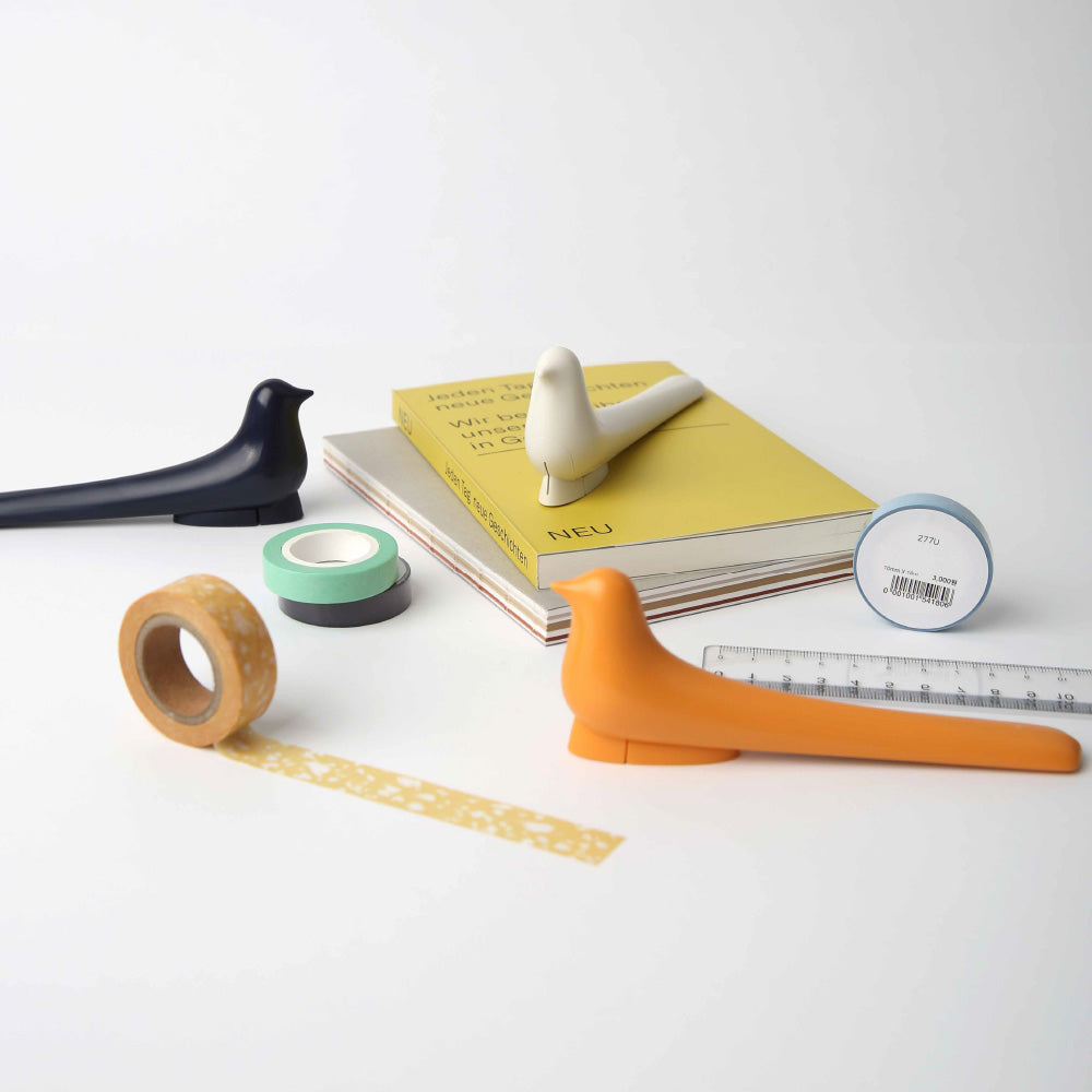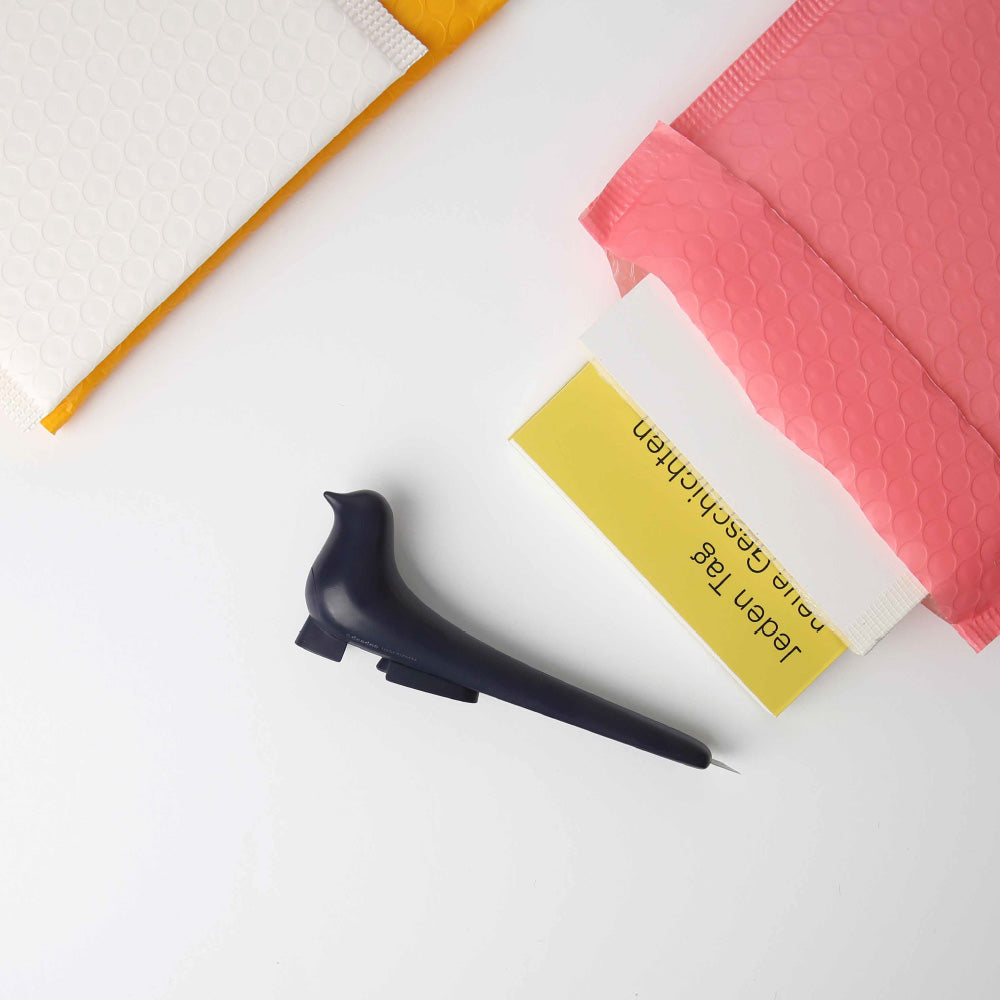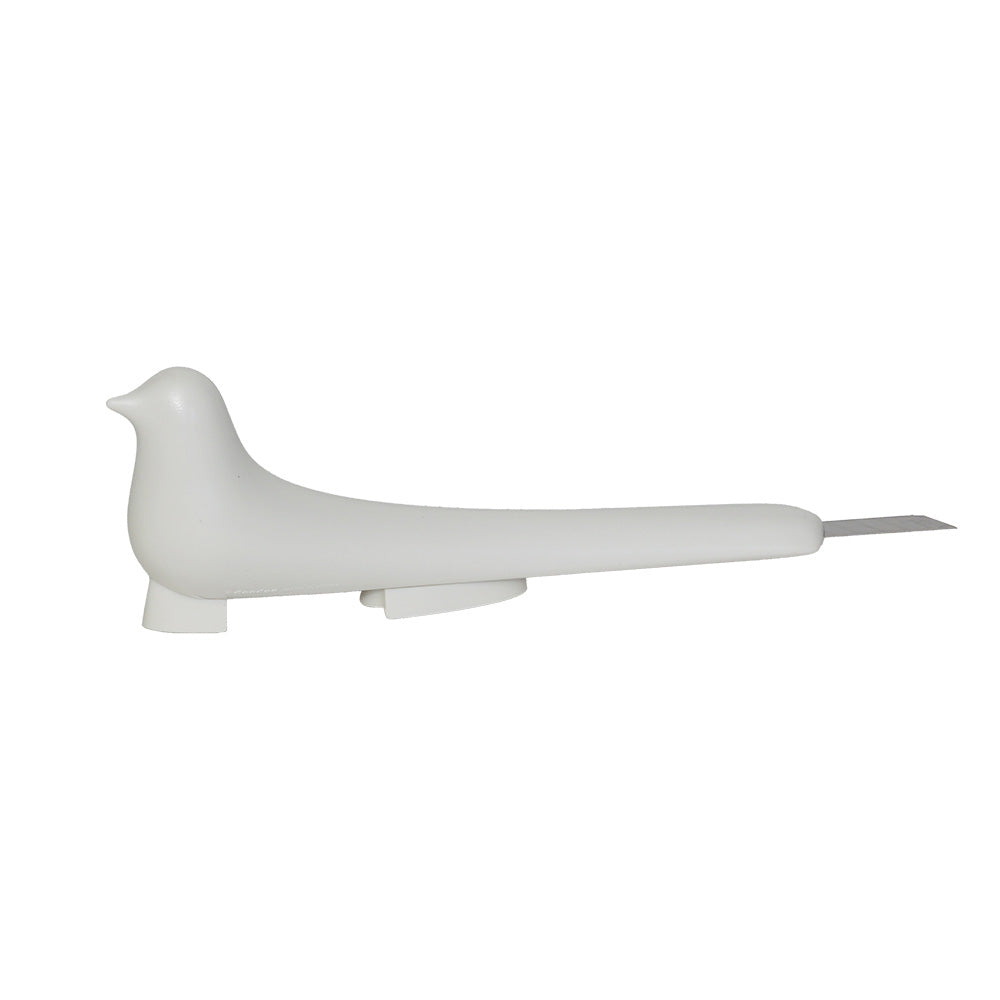 小鳥がちょこんと佇むような愛らしいフォルムの中に、実はカッターナイフの機能を忍ばせたユニークな文具。