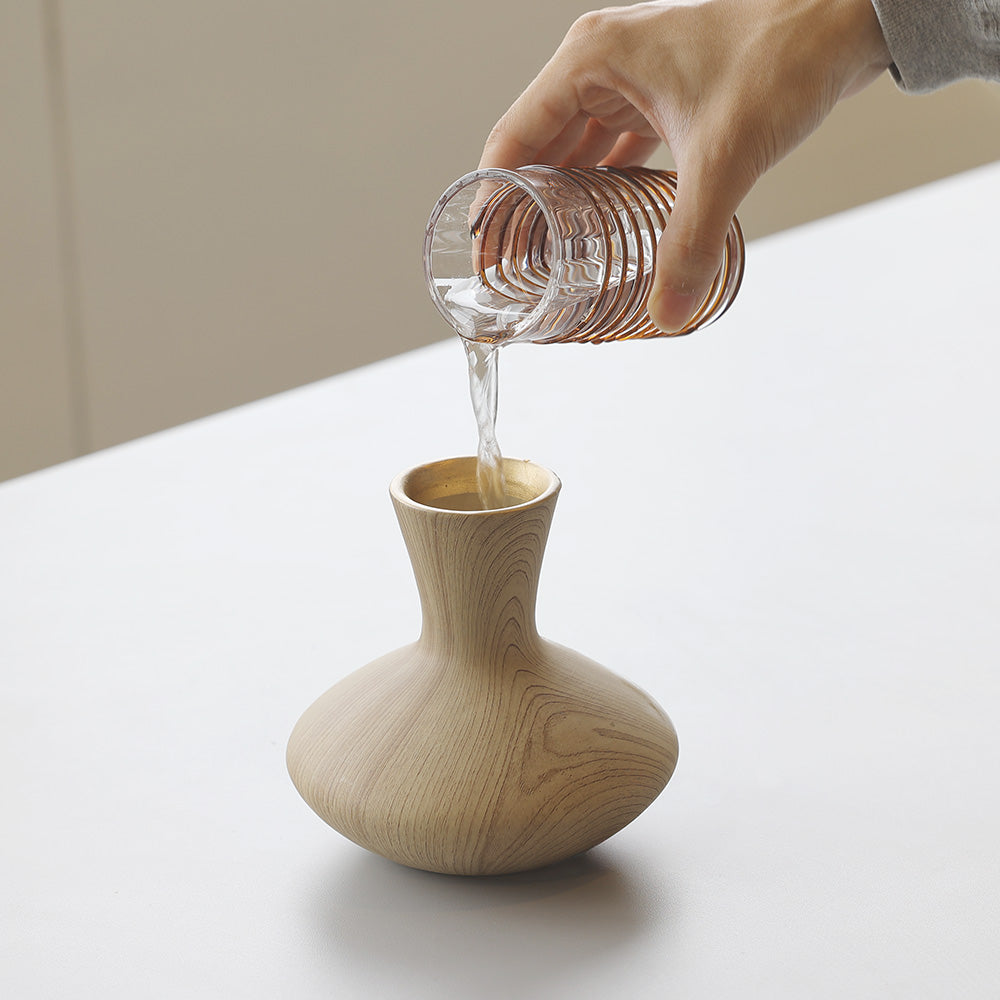 見た目は木製のようでありながら、水を入れて花を飾ることができる陶器の花瓶。
