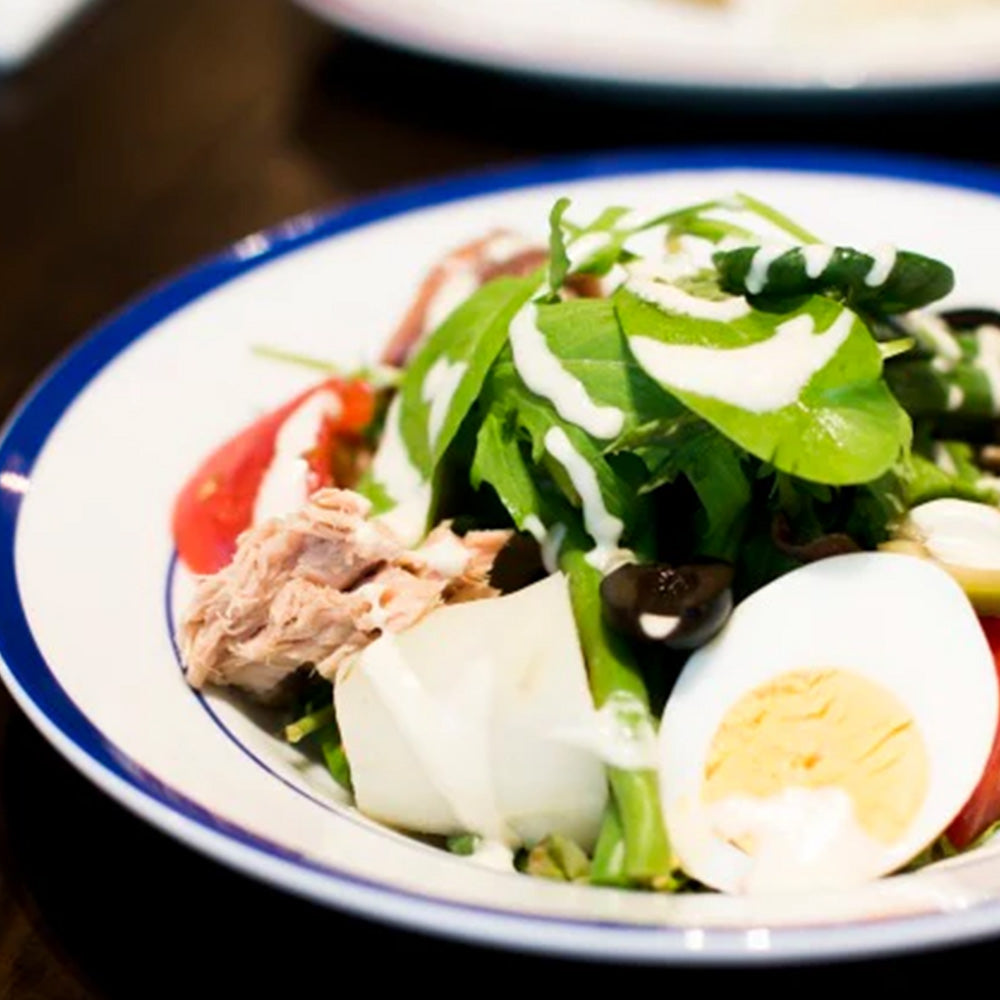フランスのビストロでの定番ブルーバンドを再現したデザインの食器